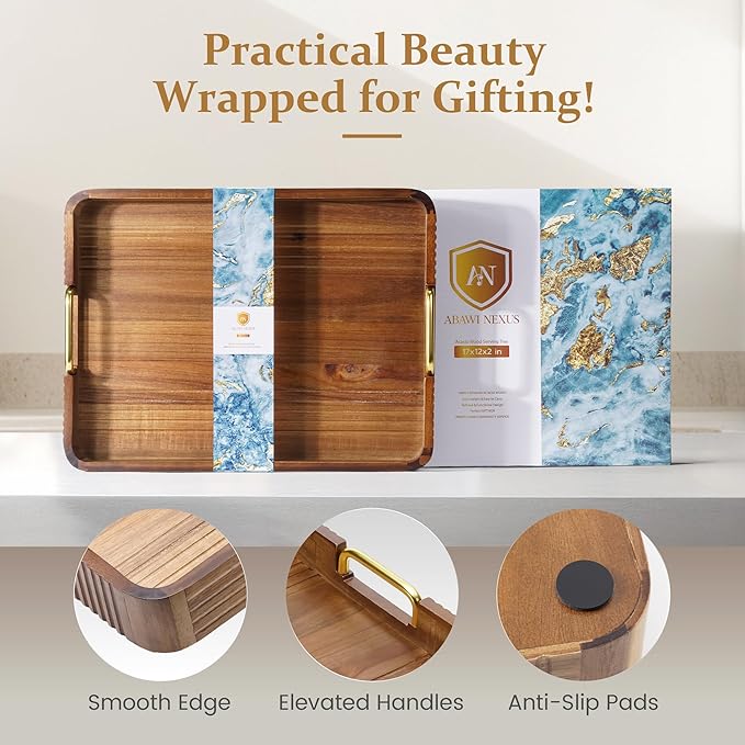 - Order with Confidence – Smooth, Safe & Easy to Clean Each decorative tray is sanded extensively to achieve a velvety smooth finish that won’t scratch furniture or delicate surfaces. The rounded edges and fully sealed acacia wood bottom prevent leaks and food adhesion, and the tray wipes clean effortlessly, maintaining its premium look for years.