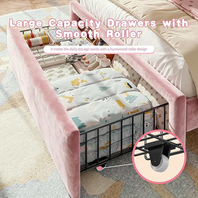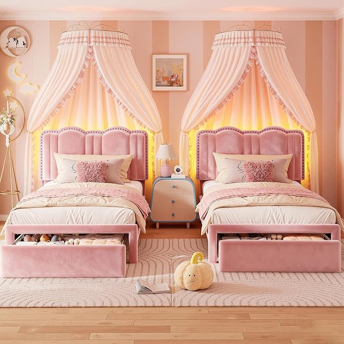 EnHomee Twin Bed Frame with Velvet Cloud Headboard, Storage Drawer and LED, Headboard Height Adjustable, Strong Support, No Box Spring Needed, Easy Assembly, Pink