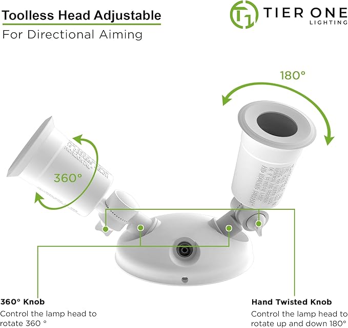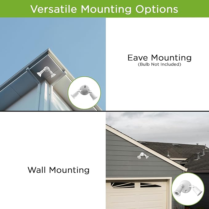 - Versatile Mounting Options - Perfect for wall-mount or eave-mount applications, tool-free adjustable heads on the outdoor light fixture offer up/down & side-to-side aiming for safety & security lighting, built-in hanging wire for easy hands -free install.