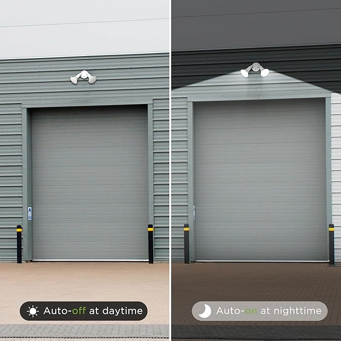 Two Head Par Light Holder with Dusk to Dawn Photocell UL Listed Outdoor Flood Light For Safety & Security 120V Twin Par Holder Use 2 PAR38 Bulbs up to 150W Each (Bulb sold separately) 1 Pack White