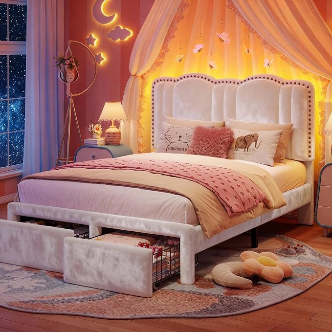 EnHomee Full Size Bed Frame with LED, Velvet Upholstered Headboard and 2 Drawers, Platform Bed Frame with Height Adjustable Headboard, Strong Support, No Box Spring Needed, Easy Assembly, Cream