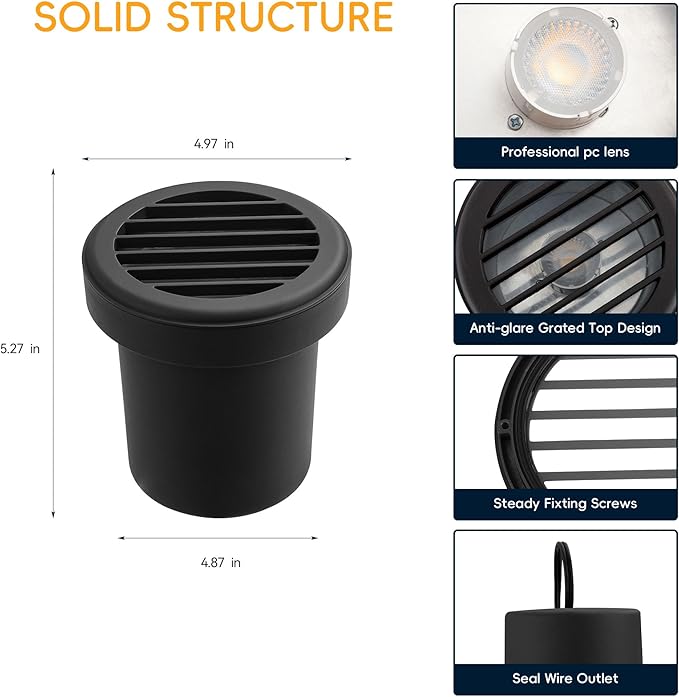 - Sturdy Flat Grated Top Design: The aluminum grated guard of this outdoor light set minimizes the glares, won't blind you when you walk by, and keeps the mulch and leaves out. The flat grille top allows you to mow over directly