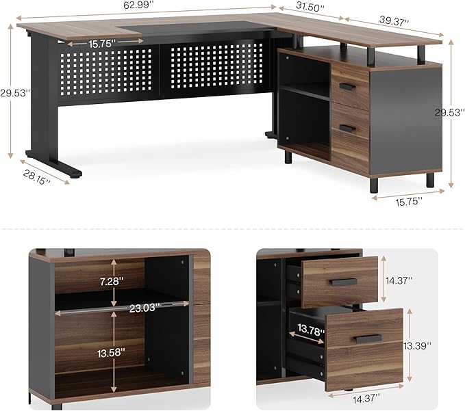 - Versatile Home Offices Furniture Set: Step into holistic productivity with our executive desk, designed as an all-encompassing workstation. A secure storage cabinet, file drawer and versatile storage shelves ensure all your resources are readily available for efficient tasks. With space for letter/A4 files in the cabinet, smaller office essentials in the drawer & open shelves, this L-shape desk is a savvy solution for multiple storage needs.