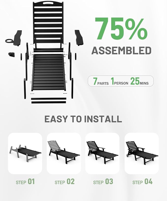 - Premium Suunyn HDPE: The polywood chaise lounge are made from high-density HDPE, which bends slightly under heavy weight or high temperature but returns to its original shape when the weight is removed or the temperature has dropped. This durable material withstands harsh weather and is easy to clean
