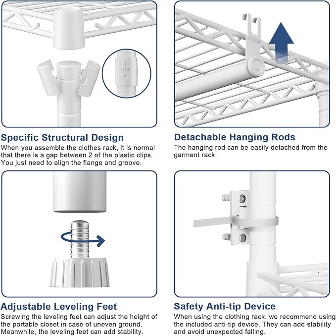 - ▶【PORTABLE & MULTI-SCENARIO】Our clothes racks for hanging clothes can be flexibly and freely assembled,You can take portable clothes rack anywhere you need it,Such as bedroom, laundry room, living room, cloakroom, hallway, etc,Coupled with the Anti-tip Device to enhance the stability of the heavy duty clothes rack,You will get a flexible closet organizer and storage system,Can be mobile or fixed!