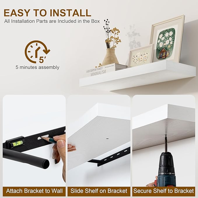 - Easy Assembly: We've included all necessary hardware and detailed instructions, so you can have your shelves mounted and ready to use in just 15 minutes with minimal effort. No stress, no fuss – just beautiful, functional shelves