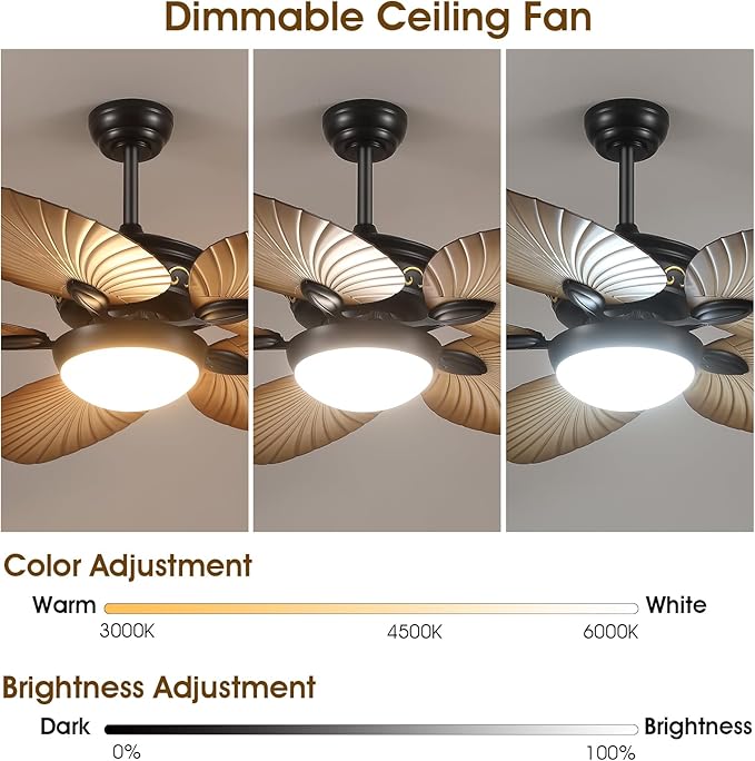 - High-quality Lighting: This leaf ceiling fan is equipped with high-quality lighting, the color and brightness are adjustable to meet your different lighting needs, making your space warmer and brighter.