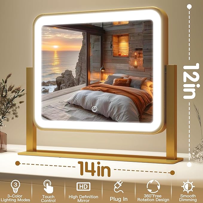 FENNIO Vanity Mirror with Lights 14x12 Inch - Makeup Mirror with Lights Tabletop, 3-Color Dimmable Lighted Mirror, Touch Control Desktop Mirror for Women (Gold)