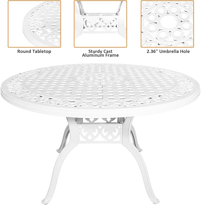 48" Round Patio Table for 6-8 Person Cast Aluminum Bistro Table with 2.36" Umbrella Hole,Metal Outdoor Dining Tables,Wrought Iron Patio Bistro Table,White Patio Table.