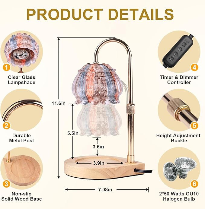 - 【SAFETY & ENVIRONMENTAL】Equippted with 50-watt halogen warming bulb (included), melt candles efficiently and safely. No open flame, let you away from fire and pollution smoke, and enjoying every minute of fragrant fresh air. Suitable for all sizes of jar candles, recommended sizes up to 5.5 inches.Two light bulbs are included in the package. ( Candle not included)