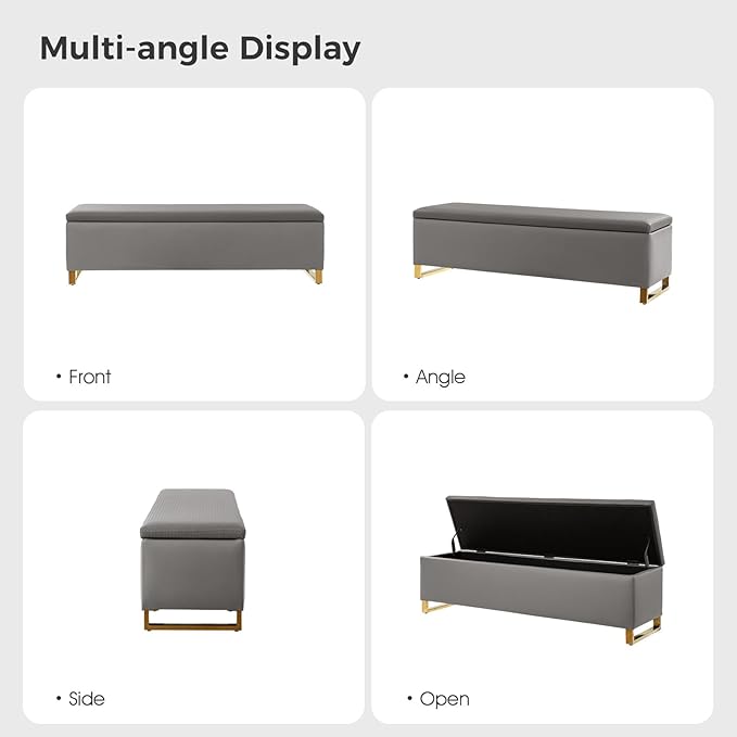EcoHarbor Living Storage Ottoman Bench with Throw Ottomans, Modern End of Bed Bench, Upholstered Footrest Stool with Gold Legs for Living, Bedroom, Entryway and Hallway(Grey 60inch)