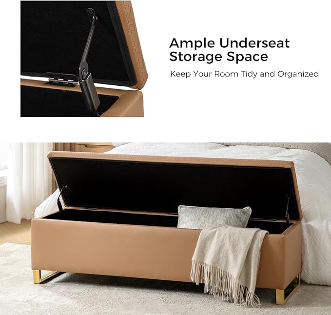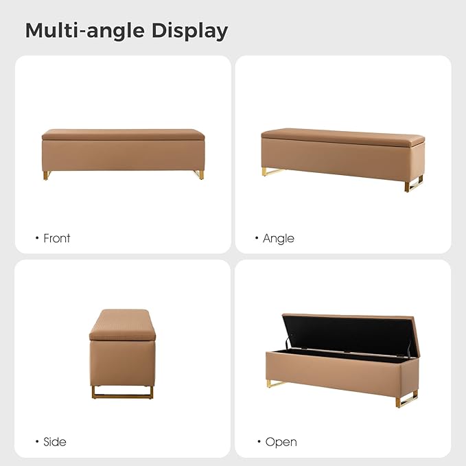 EcoHarbor Living Storage Ottoman Bench with Throw Ottomans, Modern End of Bed Bench, Upholstered Footrest Stool with Gold Legs for Living, Bedroom, Entryway and Hallway(Camel 60inch)