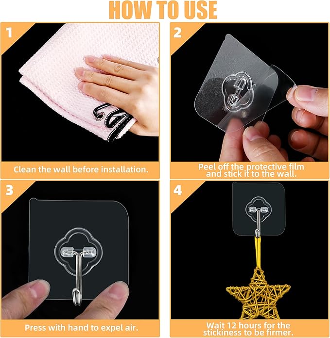 - Easy to Use and Easy to Remove: There is a protective film on the back of the clear and durable hooks. When using sticky wall hooks, just tear off the protective film on the back and stick it to the desired position without drilling. When you want to remove the adhesive wall hooks, you can use a hair dryer or a hot air gun to heat the bottom of the hook for 1-2 minutes, and then carefully peel the hook off the surface. If there is sticky residue on the wall, you can wipe it with alcohol.