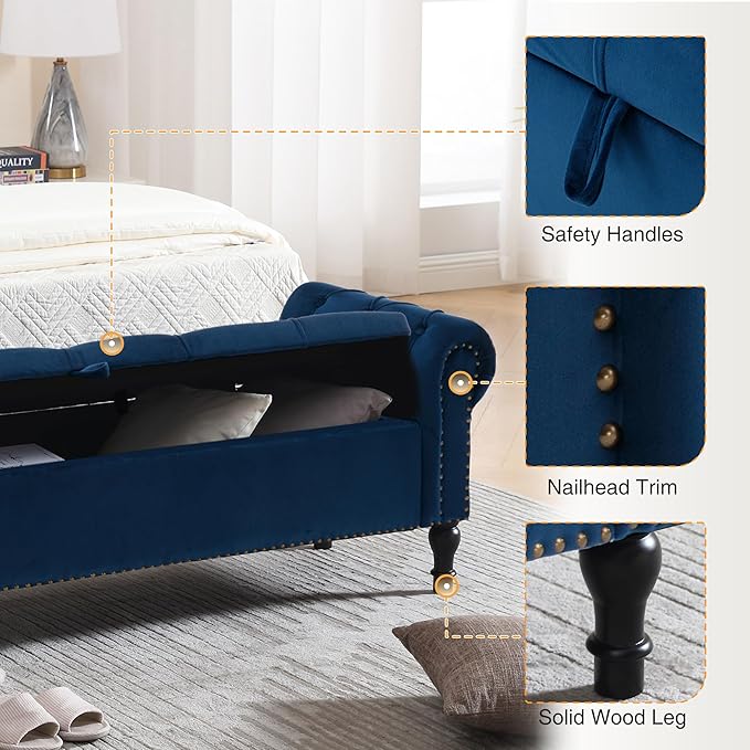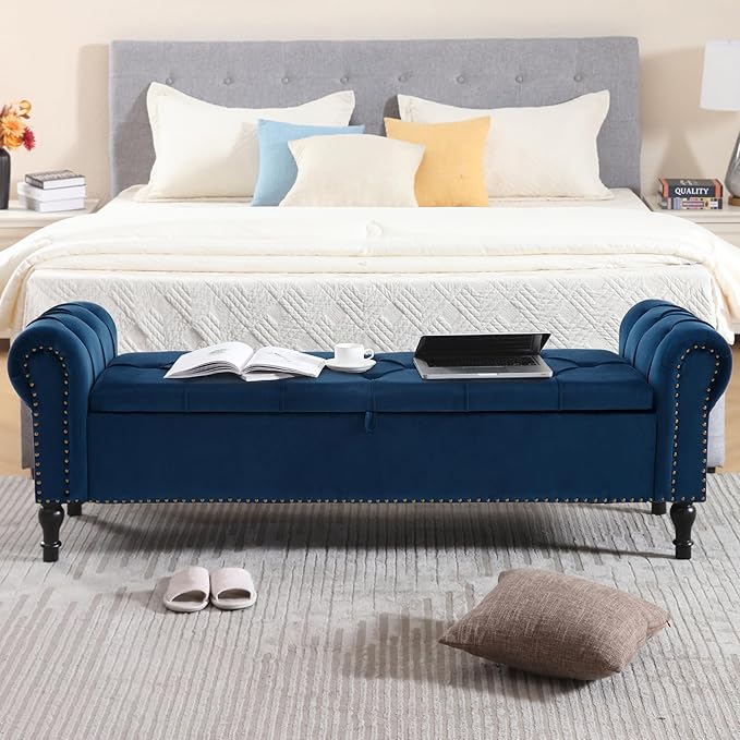 - ELEGANT MODERN STYLE: The storage bench that provides extra support, more than just an ornament. this long velvet end of bed storage bench with button tufted upholstered flap, exquisite and beautiful. High-density sponge padded and premium velvet fabric, studded trim on the rolled arms make this bench a stylish piece that adds a touch of sophistication to your room.