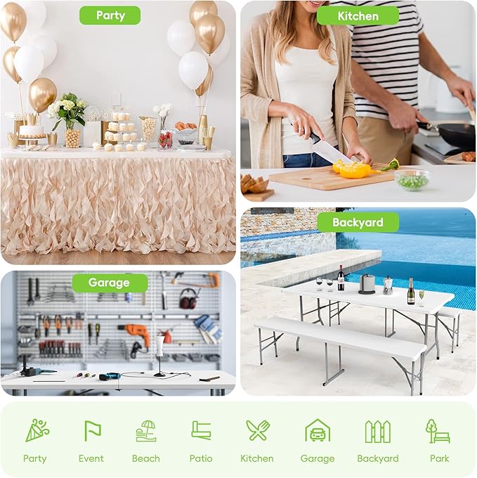 - Versatile & Practical: Whether you're hosting a party or looking for a workspace solution, this versatile folding table and bench set is perfect for use in a variety of indoor and outdoor settings, including patios, gardens, poolside areas, lawns, and more