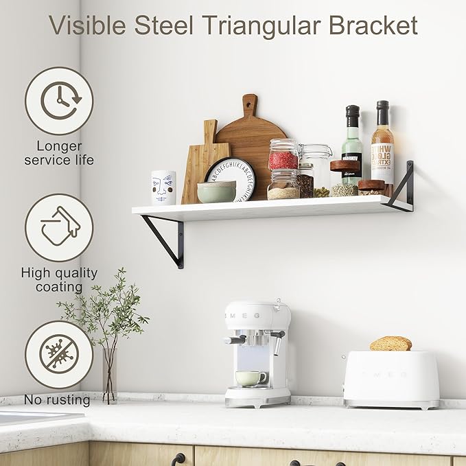 - 【FARMHOUSE RUSTIC WALL SHELF】These floating shelves are made of premium engineered wood board and visible triangular bracket. The rustic wooden grain surface add character and warmth to any modern or traditional interior with these deep floating shelves, contrast shelves at staggering heights on the wall or mount side-by-side or in the corner for a clean streamlined look.