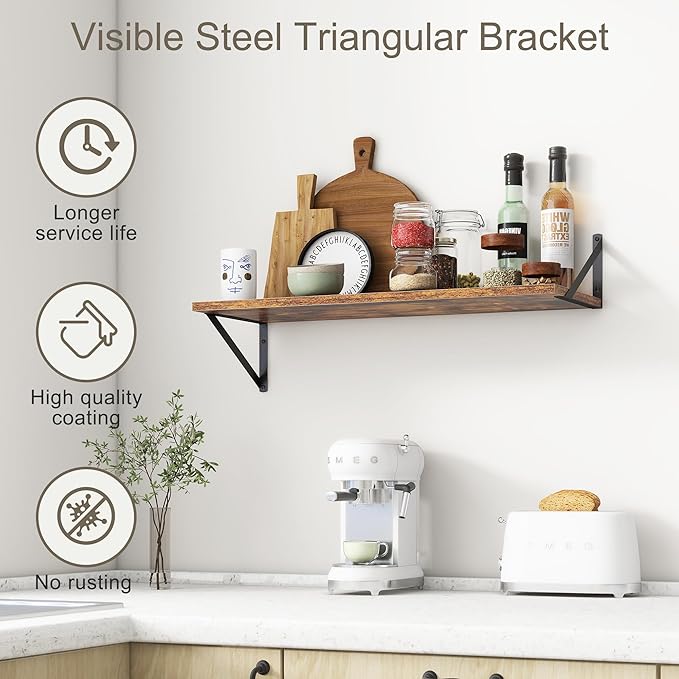 - 【FARMHOUSE RUSTIC WALL SHELF】These floating shelves are made of premium engineered wood board and visible triangular bracket. The rustic wooden grain surface add character and warmth to any modern or traditional interior with these deep floating shelves, contrast shelves at staggering heights on the wall or mount side-by-side or in the corner for a clean streamlined look.