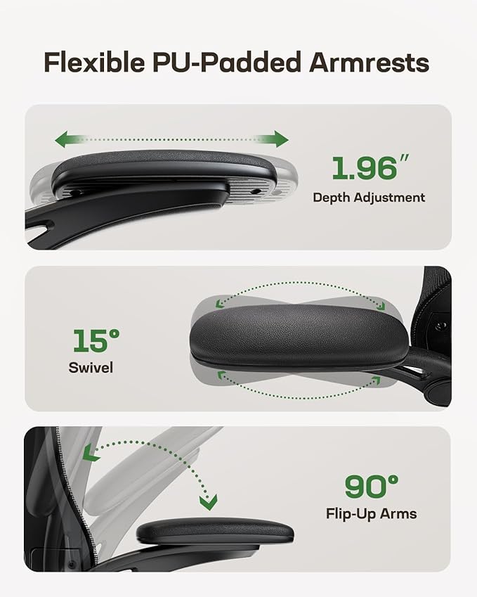 - FLEXIBLE ARMRESTS: Rest your arms on the comfortable PU-padded surface of these smoothly rounded armrests. Move them forward or back and swivel them left or right to find the optimal arm position. Flip the armrests up when you want more freedom or to easily slide the chair under the desk.