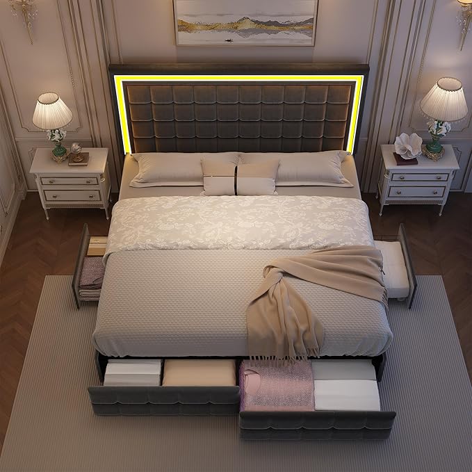 Full Bed Frame with LED Lighting and Storage Drawers, No Box Spring Needed, Supports 900 lbs, Easy Assembly, Quiet and Sturdy Design, Velvet Gray