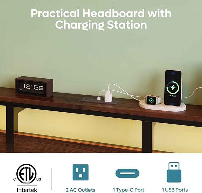 - 【Convenient Charging Station & LED Light】 The king bed frame with headboard features 1 Type-C, 1 USB A port, and 2 AC outlets to keep your devices powered and within easy reach. Use the remote, app or wire control to select from 22 dynamic modes and 7 colors to match your mood.