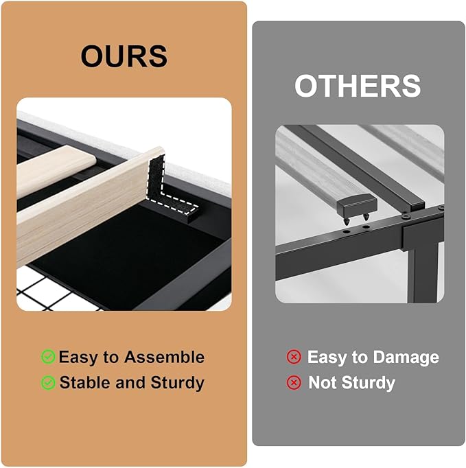 - 【Solid Construction & Noise Free Design】This bed frame with adjustable headboard is constructed of a solid metal joint frame and wooden slats and sturdy legs to ensure durability and stability, no bulky box springs required. The weight capacity is 1000 lbs. The unique locking design can fix the slats more firmly, and the EVA sponge strip under the center rod prevents noise between metals, this structure is designed to provide you with a great sense of security and a restful sleep.