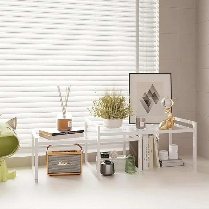 - Adjustable Organizer - You get multiple ways to use these shelves: as 2 individual cabinet shelves, as 1 long joint storage rack when lined up, as 1 stackable shelf organizer when stacked up or connect them at right angles to fit around corners