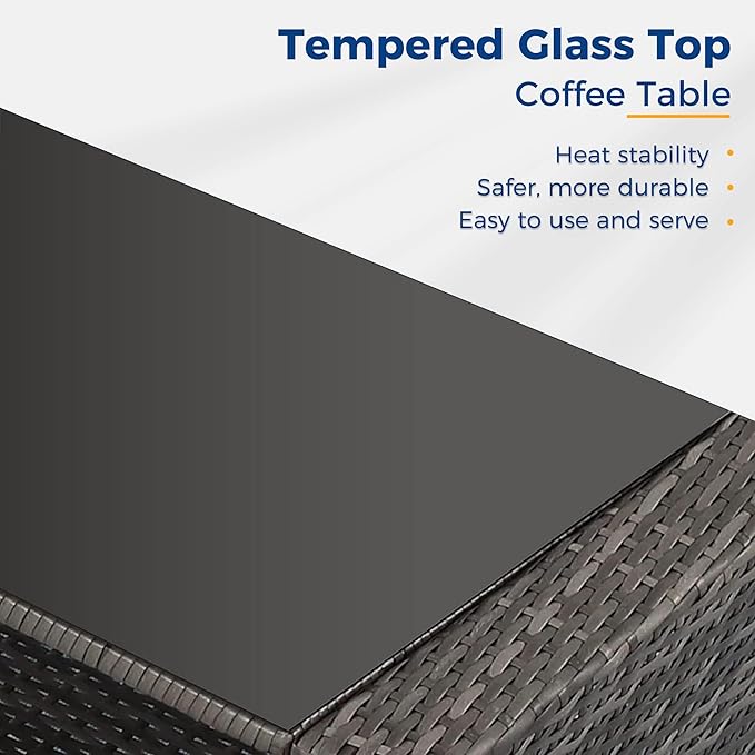- 【Easy to Maintain Patio Furniture】Cleaning and maintaining this patio furniture is a breeze. The cushion covers can be easily removed with the zipper design, allowing for convenient cleaning. The splash-proof material ensures hassle-free maintenance. Additionally, the tempered glass top of the coffee table can be cleaned by simply soaking a towel in fresh water. For tough stains, soak the towel in water at 100°F for effective cleaning.