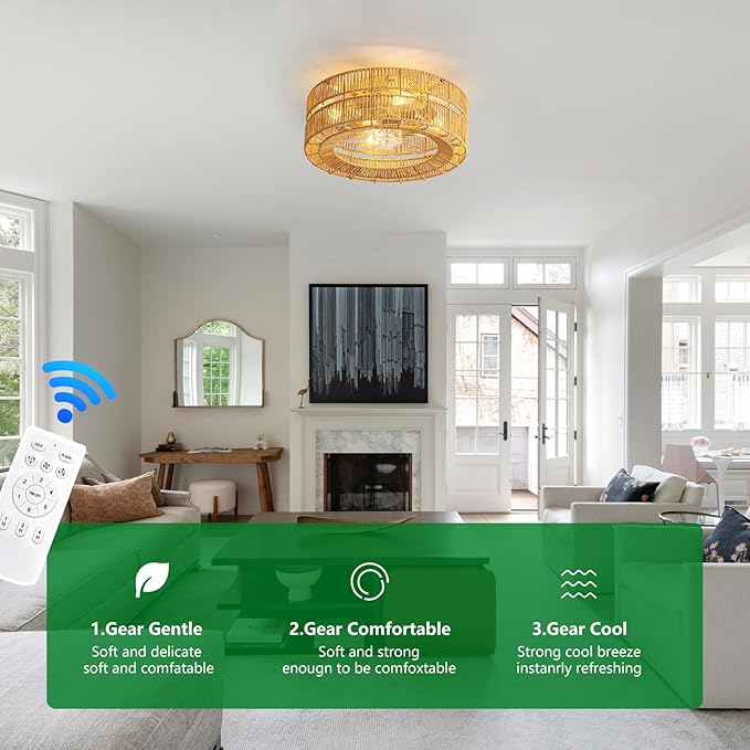 - 【Remote Control & Ultra-quiet】This rattan flush mount ceiling fan with lights features silent clear fan blades and quiet pure copper motor to reduce vibration and noise, make the wind more soft and comfortable, and it features a timer with 1, 2, and 4-hour options, so you can use it while sleeping,saving power and create a quiet and comfortable sleeping environment for you.