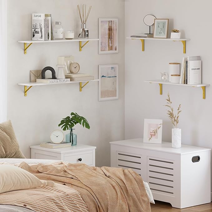 DINZI LVJ Long Wall Shelves, Set of 4, 31.5Inch Wall Mounted Shelves, Floating Shelves for Wall Storage with Metal Brackets, for Living Room, Bathroom, Bedroom, Kitchen, White and Gold