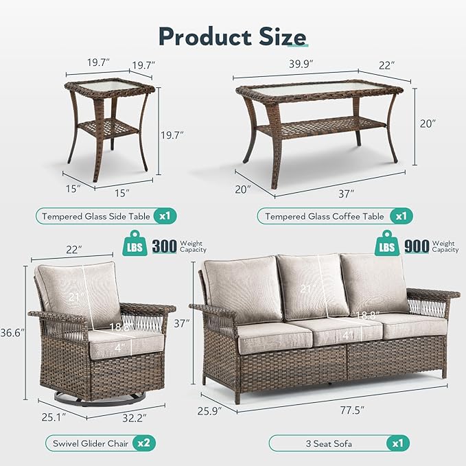 - Stylish 5-Piece Patio Set - This wicker patio furniture set includes two outdoor swivel glider chairs, a 3 seat sofa, a glass side table and coffee table, blending comfort with an elegant design. Ideal for decks, porches, backyards, and balconies, the outdoor patio furniture set enhance your outdoor space with both style and functionality