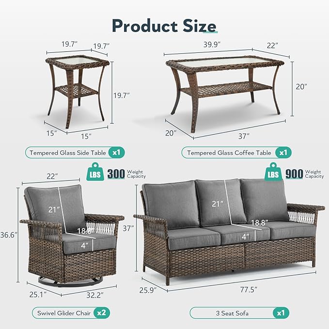 - Stylish 5-Piece Patio Set - This wicker patio furniture set includes two outdoor swivel glider chairs, a 3 seat sofa, a glass side table and coffee table, blending comfort with an elegant design. Ideal for decks, porches, backyards, and balconies, the outdoor patio furniture set enhance your outdoor space with both style and functionality