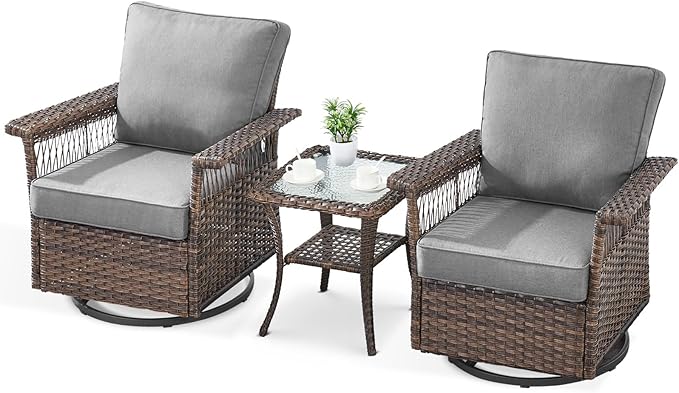 - Stylish 3-Piece Patio Set - This wicker patio furniture set includes two outdoor swivel glider chairs and a glass side table, blending comfort with an elegant design. Ideal for decks, porches, backyards, and balconies, these outdoor swivel rocker patio chairs enhance your outdoor space with both style and functionality