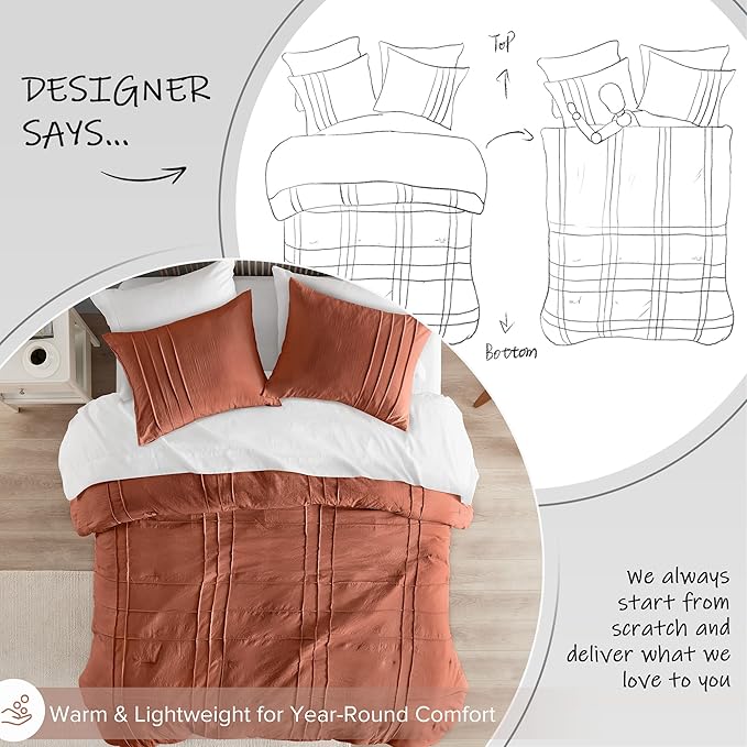 Comfort Spaces Clay Queen Size Comforter Set - 3 Pieces Pintuck Pleated Bedding Sets, All Season Lightweight, Extra Softness Pre-Washed Microfiber Queen Bed Set, Shams, Queen