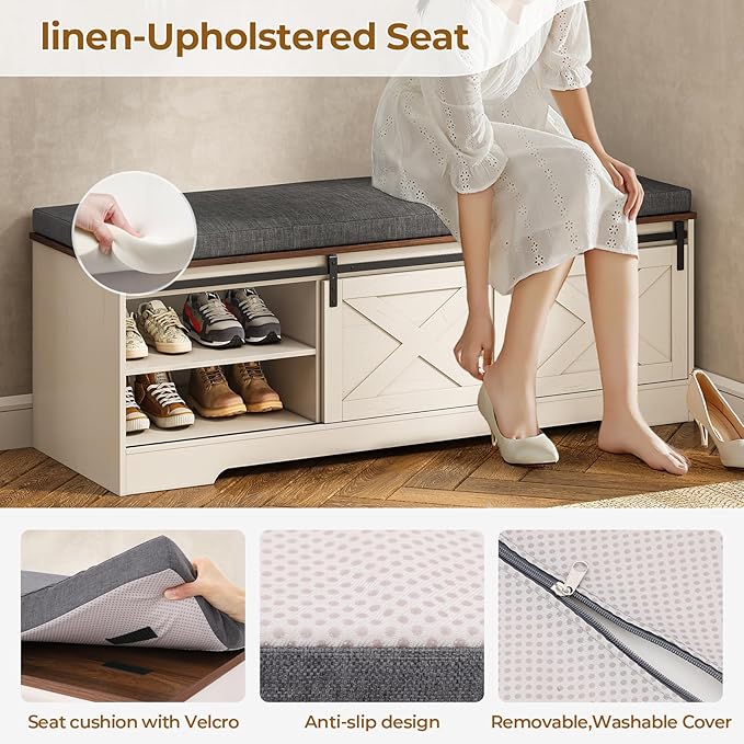 - FARMHOUSE BARN STYLE SHOE BENCH: The farmhouse barn door and linen cushions are perfectly combined to create a low-key and sophisticated style. The removable cushion cover is very convenient for cleaning. This shoe bench can not only serve as a practical shoe storage solution, but also doubles as an elegant bench for changing shoes, injecting unique charm into your living space.