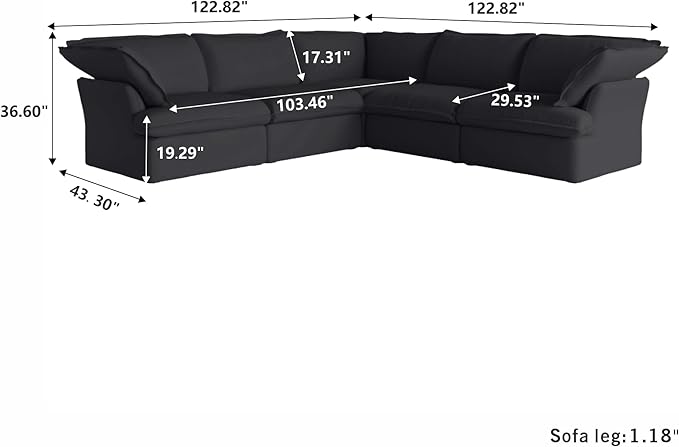 - [ Including ] 2 Seater Sofa + 2 Middle Sofas + 1 Corner. 2 Pillows. Overall Size: 124 "W x 124 "D x 23.23 "H. Sofa legs: 1.18" H. This item's simple and generous design, with coordinated color schemes, is suitable for various decoration styles.
