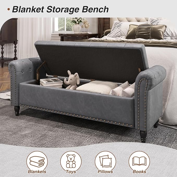 55 Inch Bedroom Bench, End of Bed Bench with Storage, Bed Benches for Foot of Bed, Faux Leather Window Bench with Rolled Arms, Upholstered Storage Bench with Tufted Button and Nailhead Trim, Gray