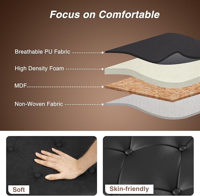 - Structural Stability: This bench for bedroom is a wooden frame structure with 4 rubberwood legs, hold up to 350 lbs; breathable faux leather cover that is watertight and wipeable; double-metal hinged top that makes it easy to lift and close