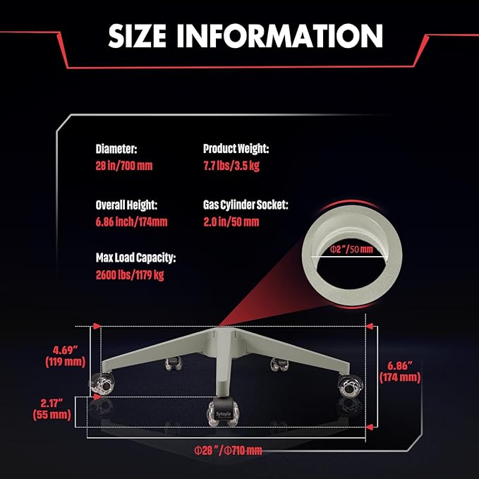 - 🏆【Universal Base Size】This 28-inch office chair base fits most gaming and office chairs. Specifications: base diameter – 28", center hole – 2", caster socket – 11 mm x 22 mm. Chair base height: 4.69" (11.9 cm); caster size: 7/16" x 7/8" (11 mm x 22 mm); caster height: 2.17" (5.5 cm); total height: 6.86" (17.4 cm).