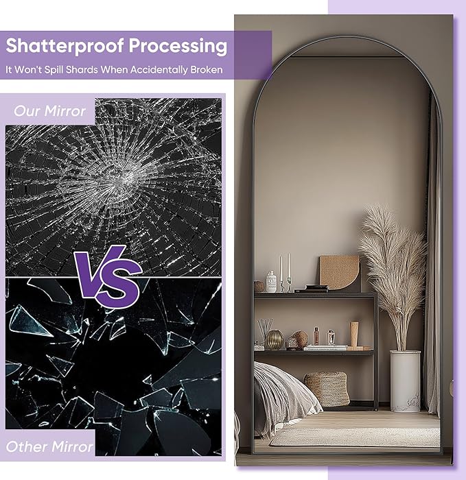 - 【Full Length Mirror】With its generous 68" height and 26" width, this mirror offers a full, clear reflection so you can confidently view your entire outfit. The arched design and minimalist frame blend effortlessly into any decor. Perfect for bedrooms, living rooms, entryways, home gyms, cloakrooms, clothing stores, and more—wherever you need a practical and stylish mirror.