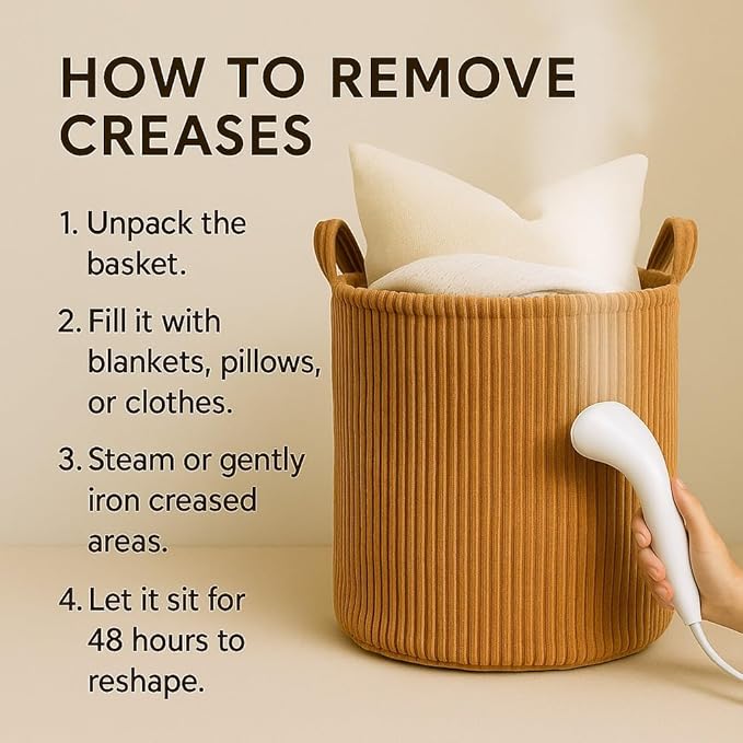 - Decorative and Versatile: This basket adds style and function to any room. To remove creases from packaging, simply fill the basket with pillows or blankets and use a steamer or iron to smooth them out