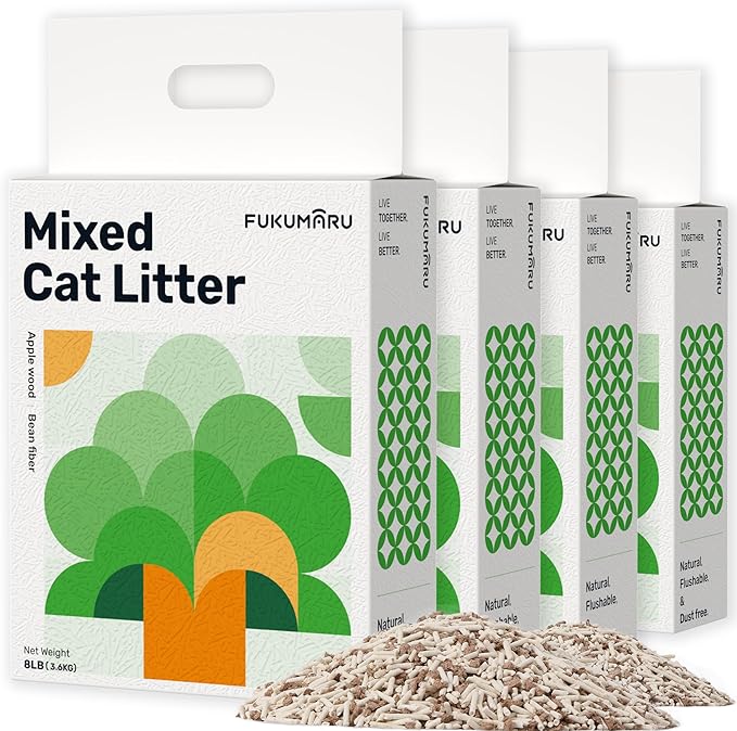 FUKUMARU Tofu Cat Litter, 32 LBS Clumping Cat Litter, Dust Free, Natural, Unscented, Flushable, Lightweight, Low Tracking, Mixed Apple Wood, 24/7 Odor Control, 8 lb x 4 Bags