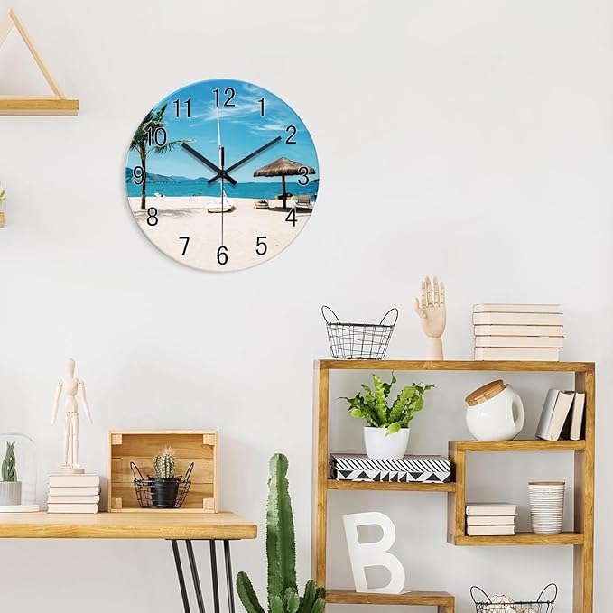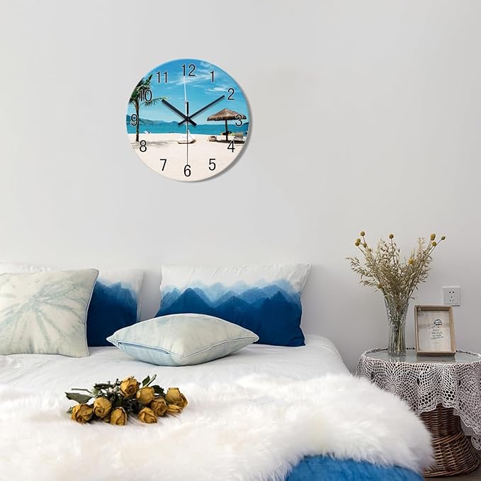 - 【DECORATIVE WALL CLOCK】Modern beach wall clock comes with a ocean beach clock face on a blue background. Especially suitable for decorating outdoor gardens, pools, porches and indoor houses, giving a fresh and unique atmosphere.The coastal wall clock will level up senses of any interior spaces. Hanging this modern beach wall clocks will add a summer vibe to any space such as living room, bedroom, bathroom, kitchen, dining room, hallway, office, or beach house.