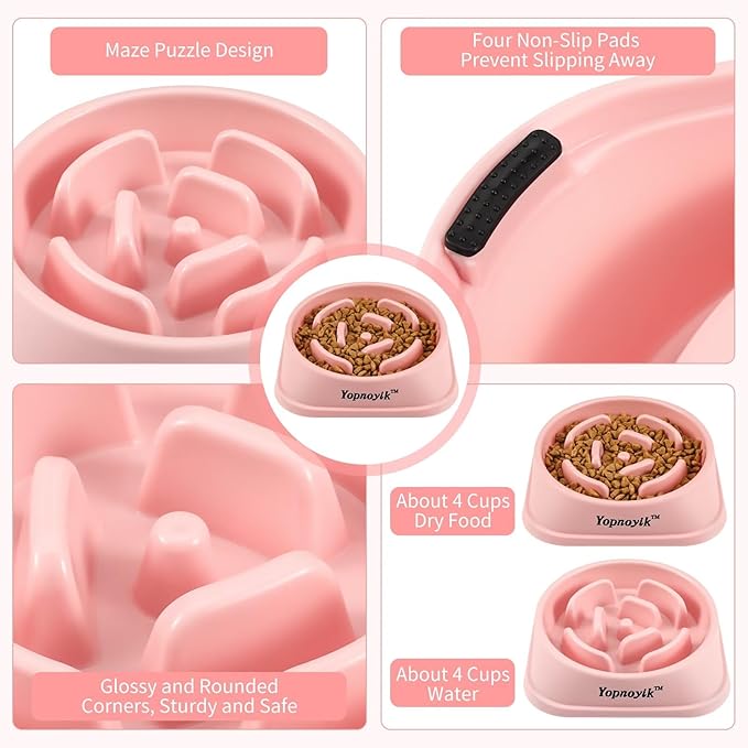 - PREMIUM DESIGN: The slow feeder dog bowl is meticulously designed to promote healthy eating habits in pets, particularly dogs prone to rapid eating. Its intricate maze-like pattern inside the bowl creates multiple obstacles for the food, compelling the pet to eat at a slower, more deliberate pace. The bowl can slow down your dog's eating time by 16X. This design not only helps in reducing the risk of choking and bloating but also aids in digestion by encouraging smaller bites.