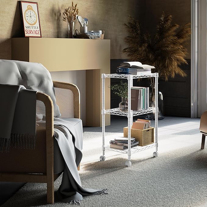 3 Tier Shelf Metal Storage Shelves Wire Rack Closet Organizers with Wheel for Garage Kitchen Bathroom Laundry White 11.8" D x 17.7" W x 29.8" H