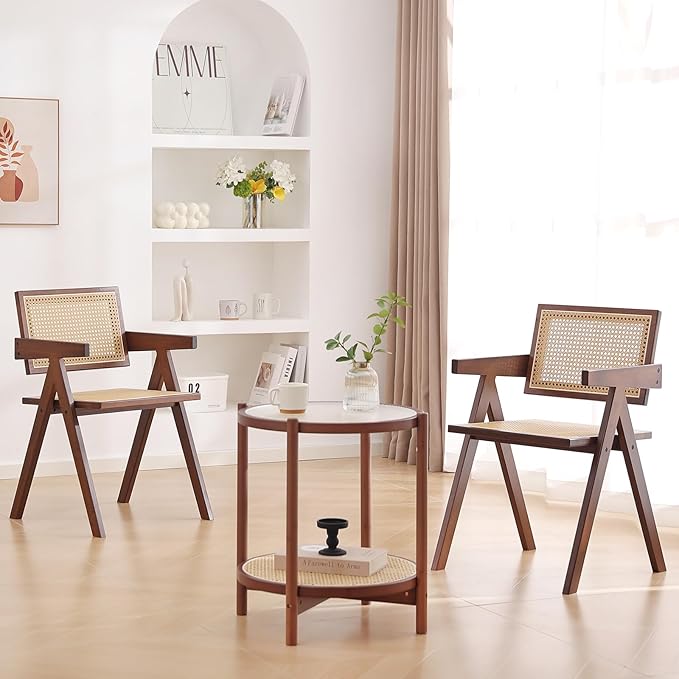 Tiita Rattan Dining Chairs Set of 2, Mid Century Modern Armchairs, Wooden Kitchen Chairs for Dining Room, Living Room, Walnut