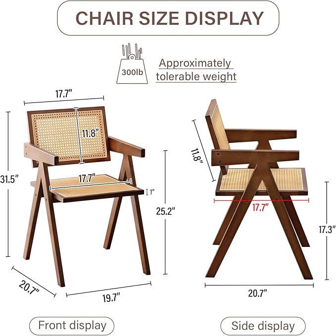 - Versatility Rattan Accent Chairs: These Rattan Accent Chairs are perfect for various settings, from garden parties to cozy indoor meals. Rattan Accent Chairs are easy to storage for small spaces. With dimensions of 19.7"D x 20.7"W x 31.5"H, these kitchen chairs maximize your living area without sacrificing comfort or style
