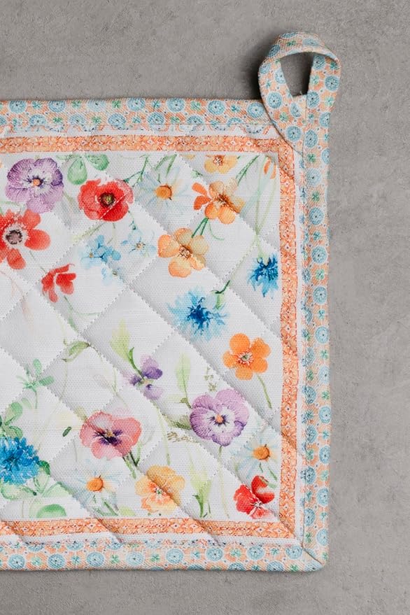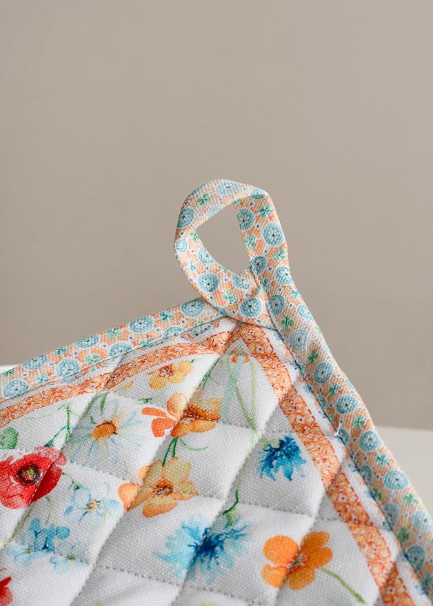 • Package includes: 2 pot holders measures 8"x8". Ideal as a hot pad for dishes, coffee pots, cast iron pans, or cookware. Designed in Europe and Made in India, it blends style, function, and comfort into a daily kitchen essential