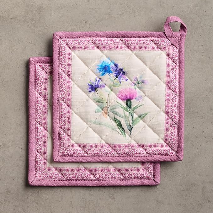 - Package includes: 2 pot holders measures 8"x8". Ideal as a hot pad for dishes, coffee pots, cast iron pans, or cookware. Designed in Europe and Made in India, it blends style, function, and comfort into a daily kitchen essential