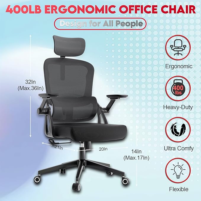 - 【400 lbs Super Strong Load Capacity】Our ergonomic office chair can support a maximum weight of 400 lbs (approximately 181 kg). All components have passed BIFMA certification and rigorous pressure tests. Equipped with a high-quality gas lift, a sturdy metal base, and smooth-rolling casters, the chair allows 360° free rotation and easy gliding.