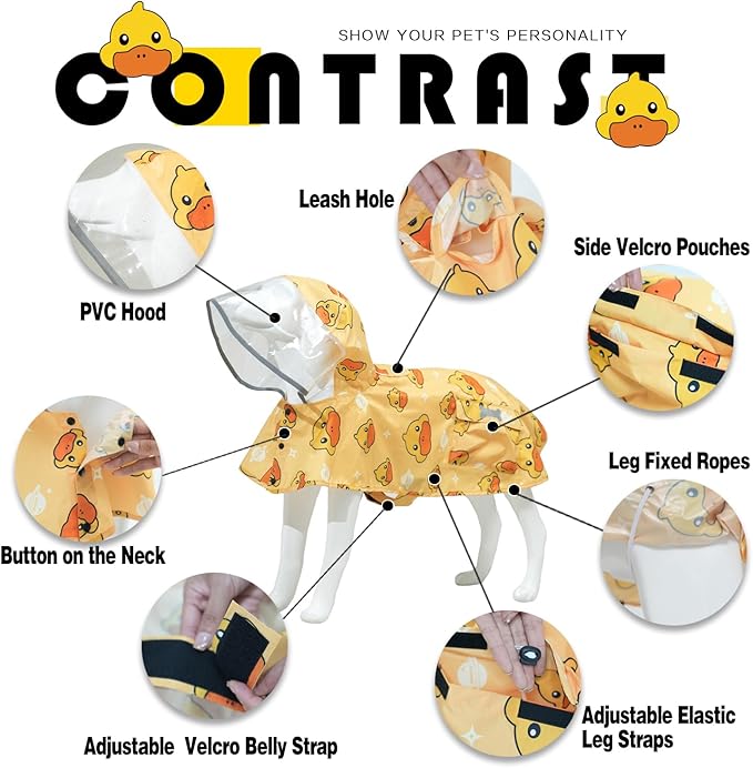 - ADJUSTABLE: Adjustable velcro belly strap and elastic leg straps to create a secure and comfortable fit for your pet. Leg straps make the raincoat in a fixed position,not easy to slide from your pet's body